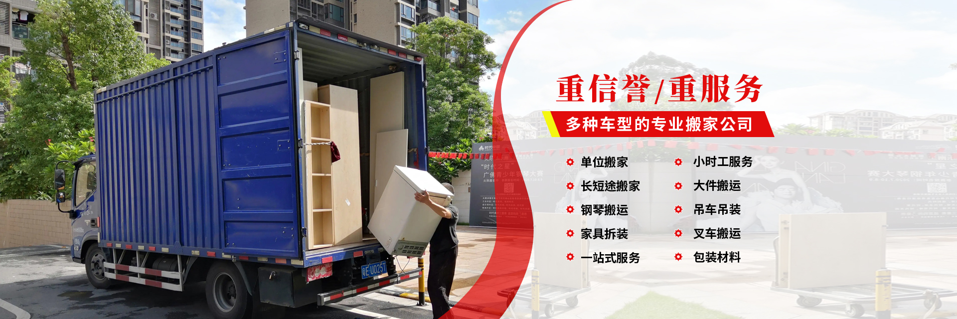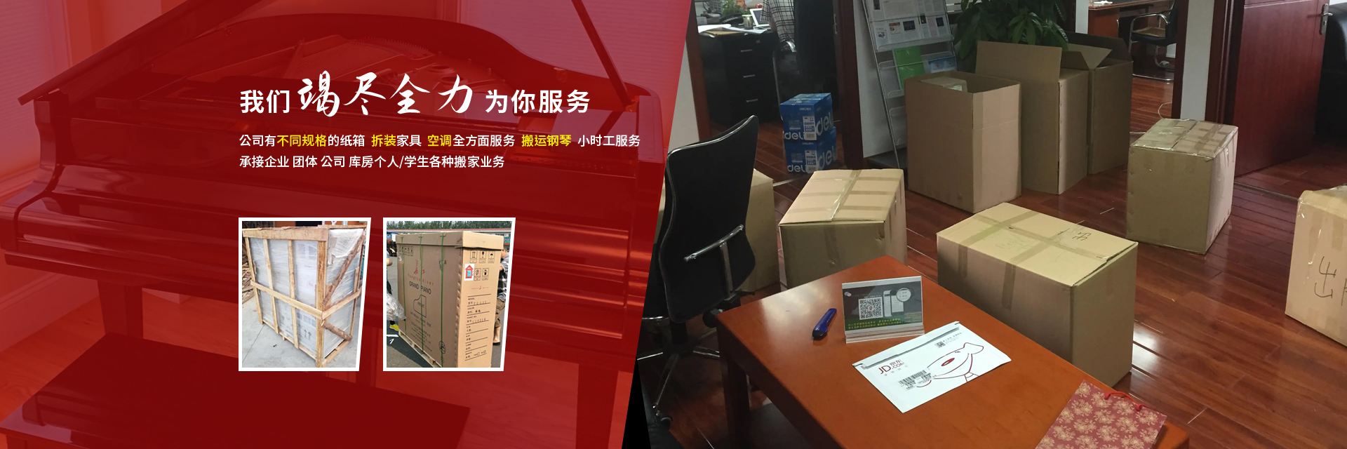 公司有不同规格的纸箱 拆装家具 空调全方面服务 搬运钢琴 小时工服务 公司承接企业 团体 公司 库房个人 学生 各种搬家业务 只要你需要我们竭尽全力为你服务 公司提倡以服务为本 合理的价格 专业的服务。